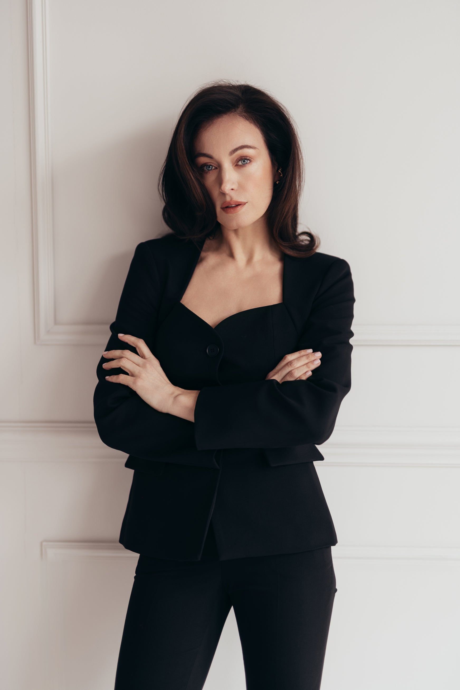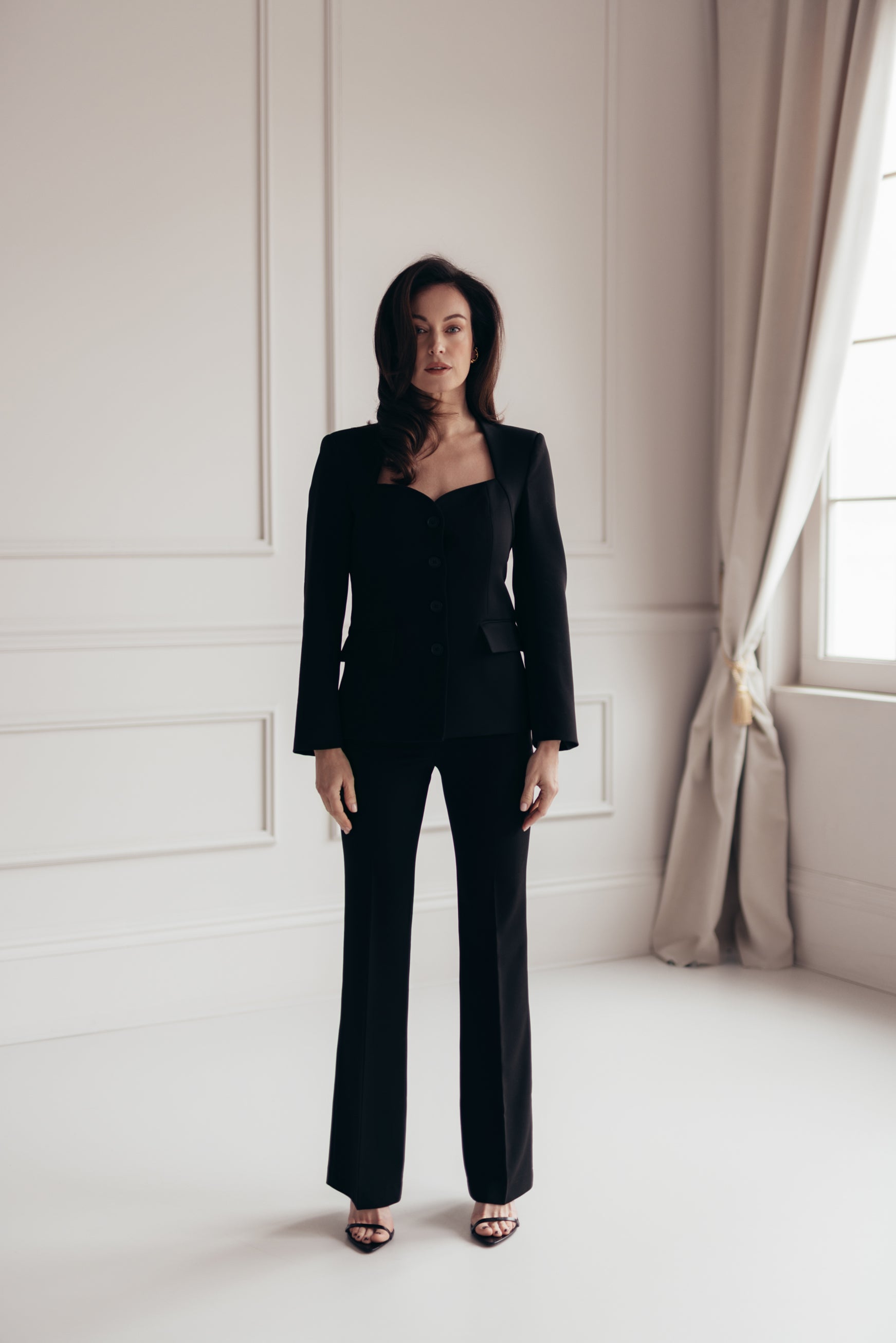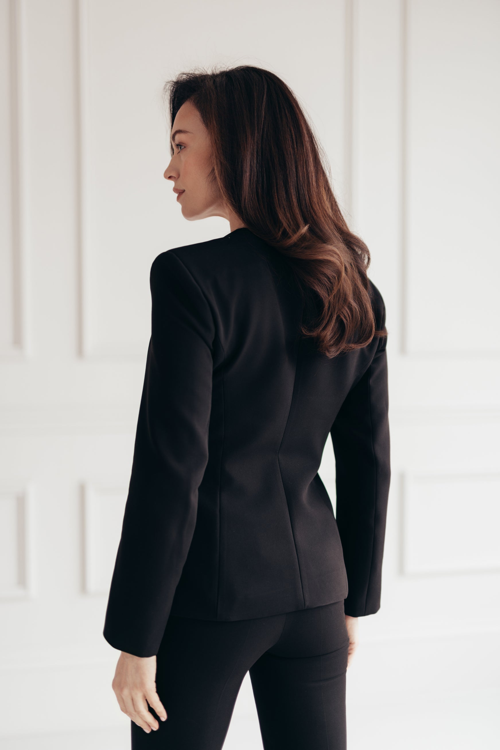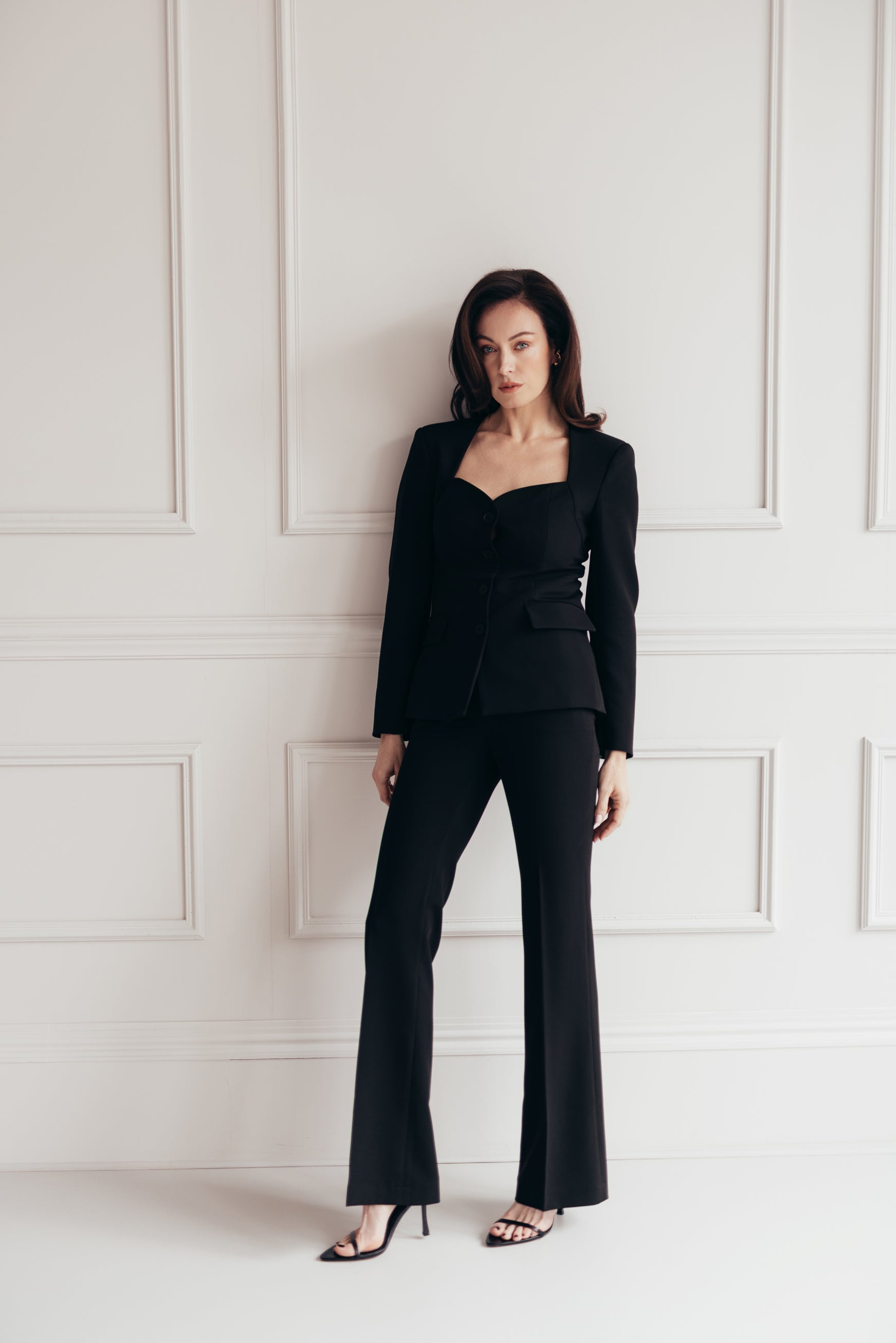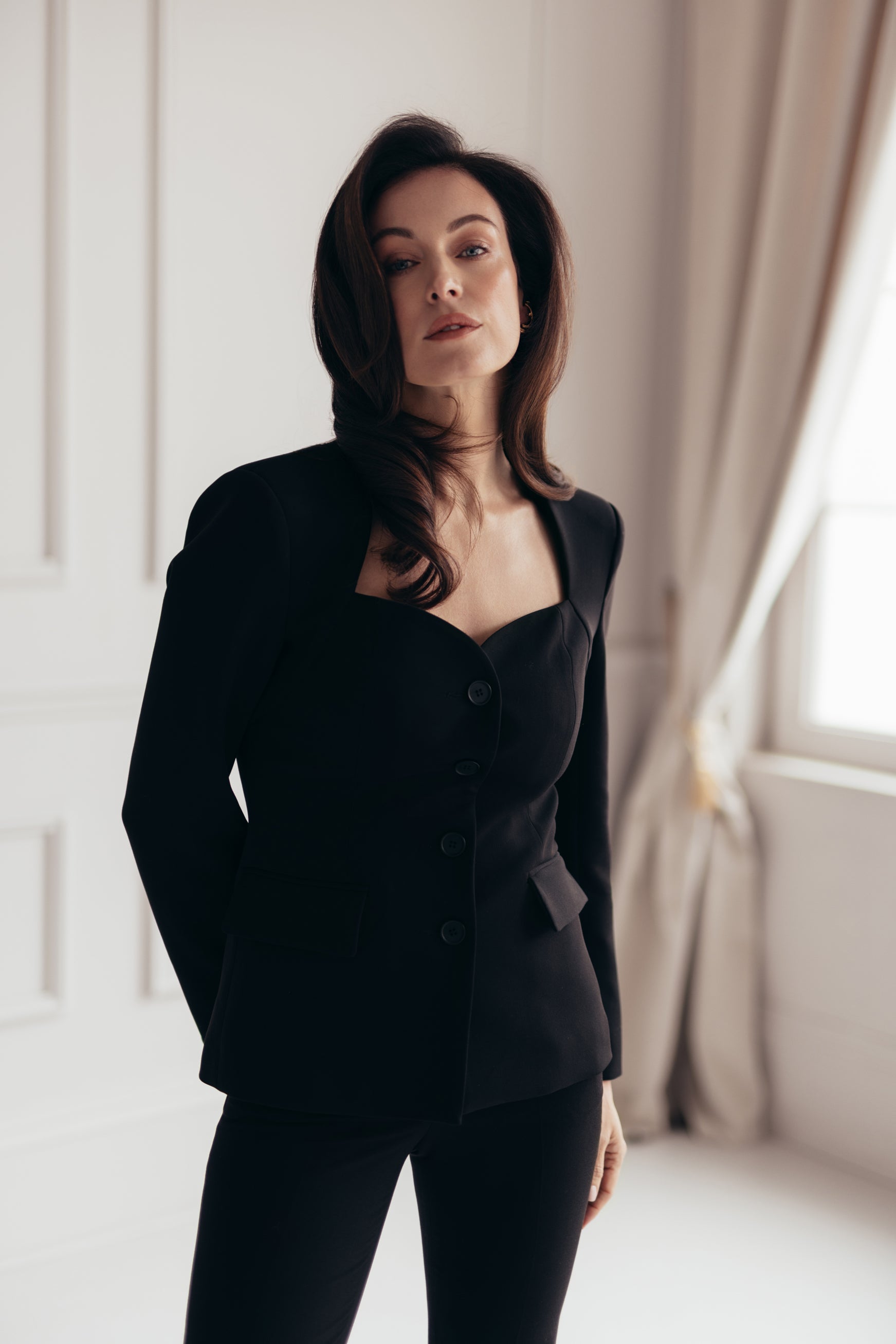 Blazer with a sweetheart neckline and long sleeves with shoulder pads. Front flap pockets and a welt chest pocket. Metching lining. Button fastening at the front.